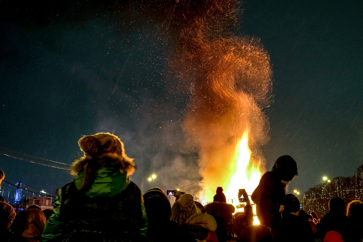 The last day of Cheesefare Week is called “Forgiveness Sunday” (Прощёное Воскресенье). Relatives and friends ask each other for forgiveness and might offer them small presents. As the culmination of the celebration people gather to “strip Lady Maslenitsa of her finery” and burn her in a bonfire. Left-over pancakes may also be thrown into the fire and Lady Maslenitsa’s ashes are buried in the snow to “fertilize the crops”.