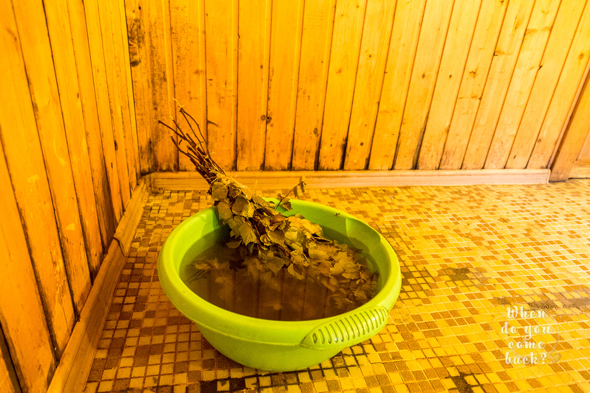 Going through Sahara and Siberia in few seconds is not enough to improve your blood circulation. There is another traditional way: banny venik, банный веник. It can be from white birch, oak or eucalyptus. It depends of the trees outside. I did with birches. The dried branches are moistened with very hot water before use. Someone have to massage your body with those branches with two different temperature: hot and cold. Under your feet, back or belly, there is no part of your body can be saved from banny venik!